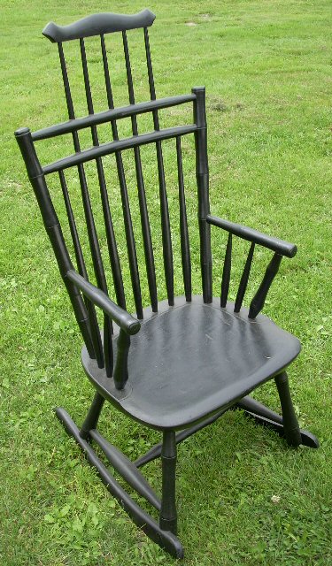 comb-back rocker in black paint, circa 1810; raised panel cupboard,