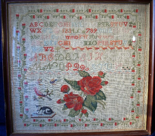 rug with cabin, trees, etc; early sampler with cat, roses, etc.,