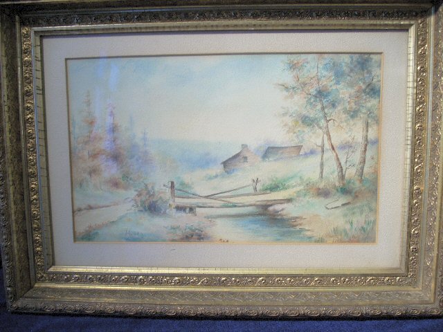 relined in gold frame; 19th c. w/c of stream with bridge, house,