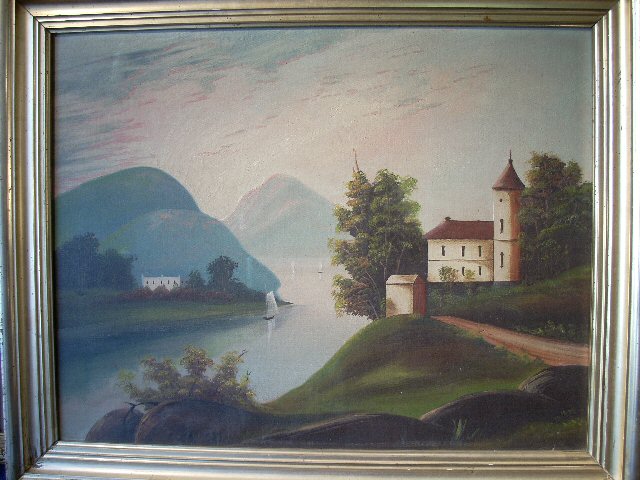 circa 1910; Hudson River School landscape with river, houses,