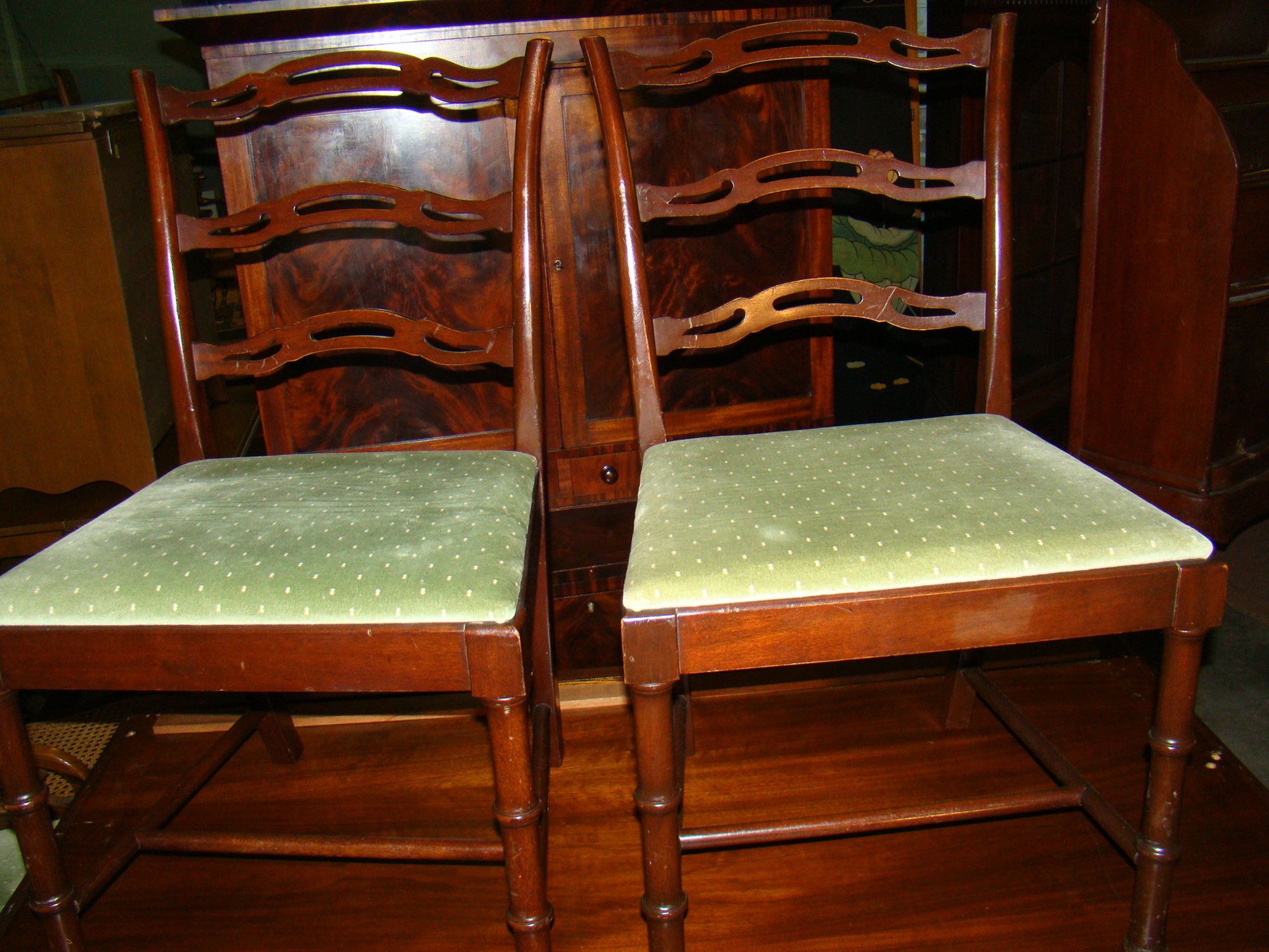 flower design on chairs and table edge; mahogany C roll-top desk;