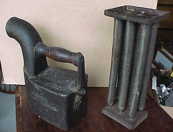 w/iron stand, rare cigar silk crazy stitched quilt, early buggy