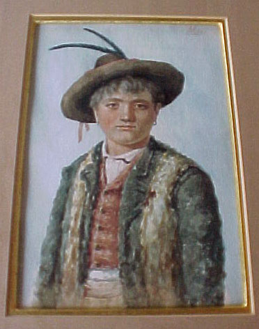 W/C of lady by G. Helf, w/c of peasant boy by Mari, pencil drawing of dog, 3