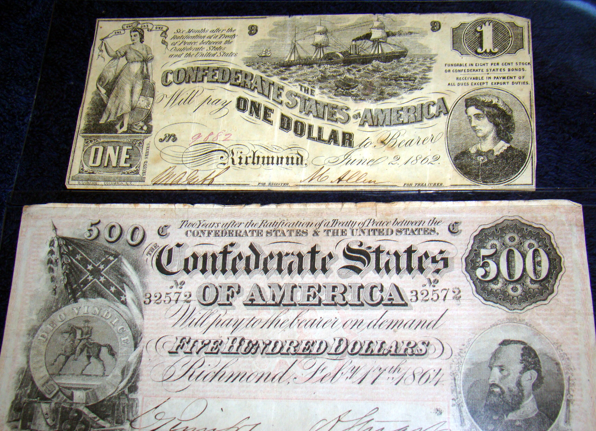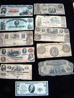 U.S. Paper Currency: Pair of consecutive serial numbered $1,000 bills, 1934 series (uncirculated); twenty uncirculated 1934 series $5 bills; $50.00 bill Virginia Treasury Note, 1862; $20.00 bill Virginia Treasury Note, 1861; $20.00 bill Exchange Bank of Virginia, 1856; $10.00 bill The Farmers Bank of North Carolina, 1859; $10.00 bill The Union Bank of Augusta, GA, 1854; $10.00 bill The Mechanics Bank of Augusta, GA, 1856; $10.00 bill, 1929 series, Hudson County National Bank, Jersey City, NJ; $3.00 bill Bank of East Tennessee, 1856; $2.00 bill Monticello Bank, Charlottesville, VA, 1861; $4.00 bill Confederate States, 1864 (small); $5.00 bill Confederate States, 1864; $2.00 bill Confederate States, 1862; $1.00 bill Confederate States, 1862; three .50-cent bills Confederate States, 1863; U.S. Fractional bills include two 10-cents, one 25-cent, and one 50-cent; 1778 6-dollar United States bill printed by Hall & Sellers; United States $2.00 bill dated 1777, also printed by Hall & Sellers. Also a tray lot with Mr. Preston’s loose stamps and letter envelopes.