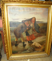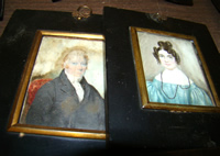 O/B titled "Happy Monhegan" by Jay Hall Connaway [1893-1970], 18" x 30" (25% paint loss); o/c of country road with cottages, trees, etc. by Charles J. Taylor [1855-1929], measures 24" x 32"; o/b seascape with rocky ledge, boats, etc. by Charles Edwin Lewis Green [1844-1915]; twelve (12) or more early miniature paintings on ivory; pair of Folk Art paintings in original matching frames, 24" x 28", of Mattie and Gus Demers, Hardscrabble Farm, East Boothbay, Maine; small watercolor of African-American boy, with a smile, admiring a piece of watermelon titled "watch dat mellon fly", 3-1/2" x 8"; three (3) English portraits with bird's-eye maple frames, signed G. Winterman, 12" x 14" each; watercolor of farmhouse with stonewall, trees, etc. by Alice Judson [1876-1948]; o/b "Fishing boats at Boothbay" by Parker Gamage [1882-1960], 12" x 16"; o/b marine ship painting by John Nichols Haapanen [1891-1968], 18" x 20"; o/b by Parker Gamage [1882-1960], "Boothbay", 16" x 20"; pair of oils "Street Scenes", by Victor de Lima; wonderful large oil in original frame of a man lighting his cigarette while holding onto his hat and a pig, lady looks on and assists him with his task by Thomas F. Keegan circa 1900!!; oil painting of 1930's racing yachts, signed G. H. Bean, 16" x 20"; watercolor titled "Winter Fix" by Sidney Eaton [1906-2004], 14" x 16"; plus lots more!!
