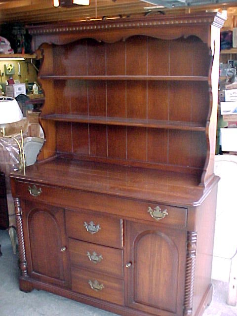 w/6 carved crest chairs, cherry open hutch w/rope-carved columns,