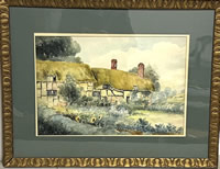 Watercolor of thatched roof cottage in hand carved frame, 16in.x22in. |