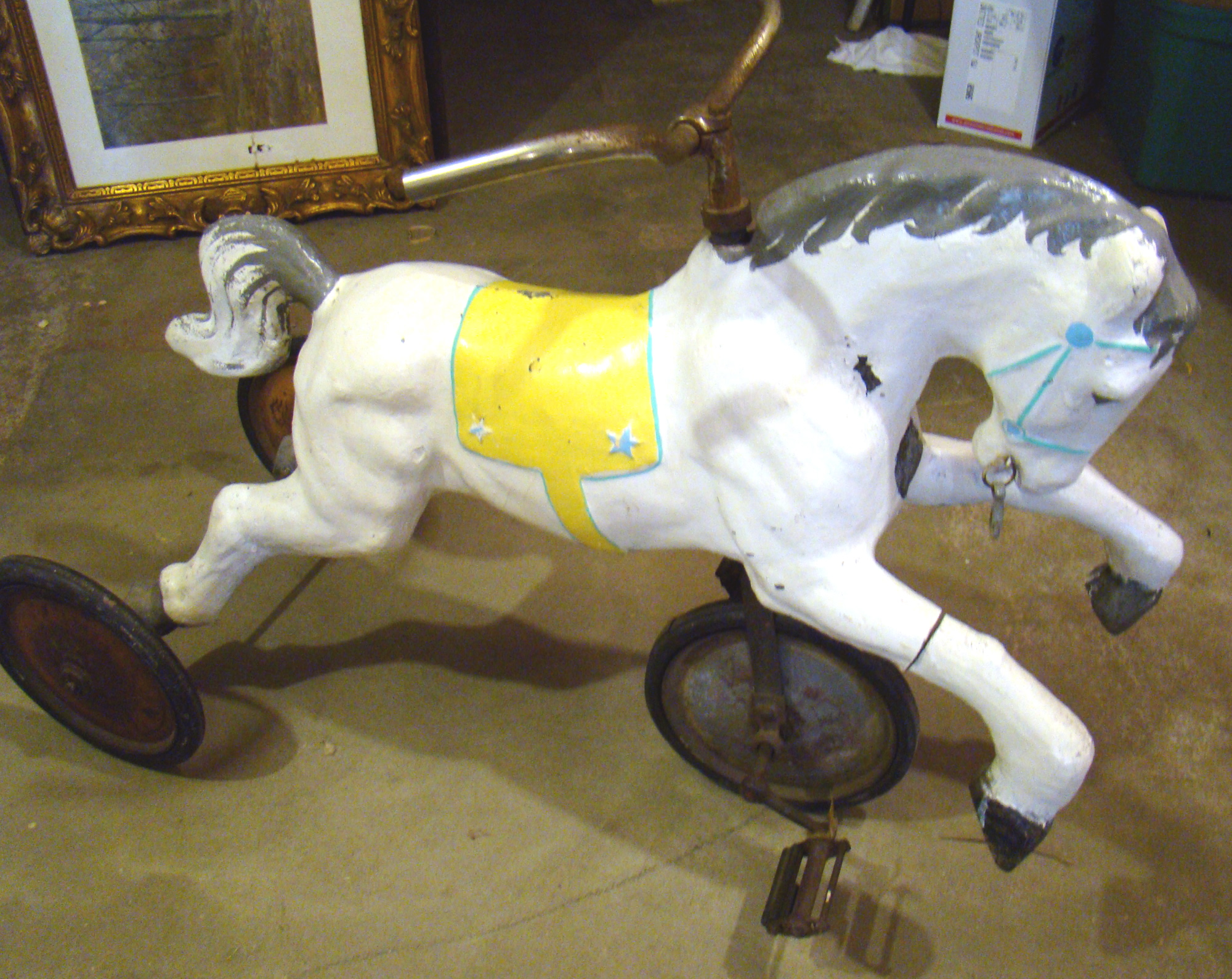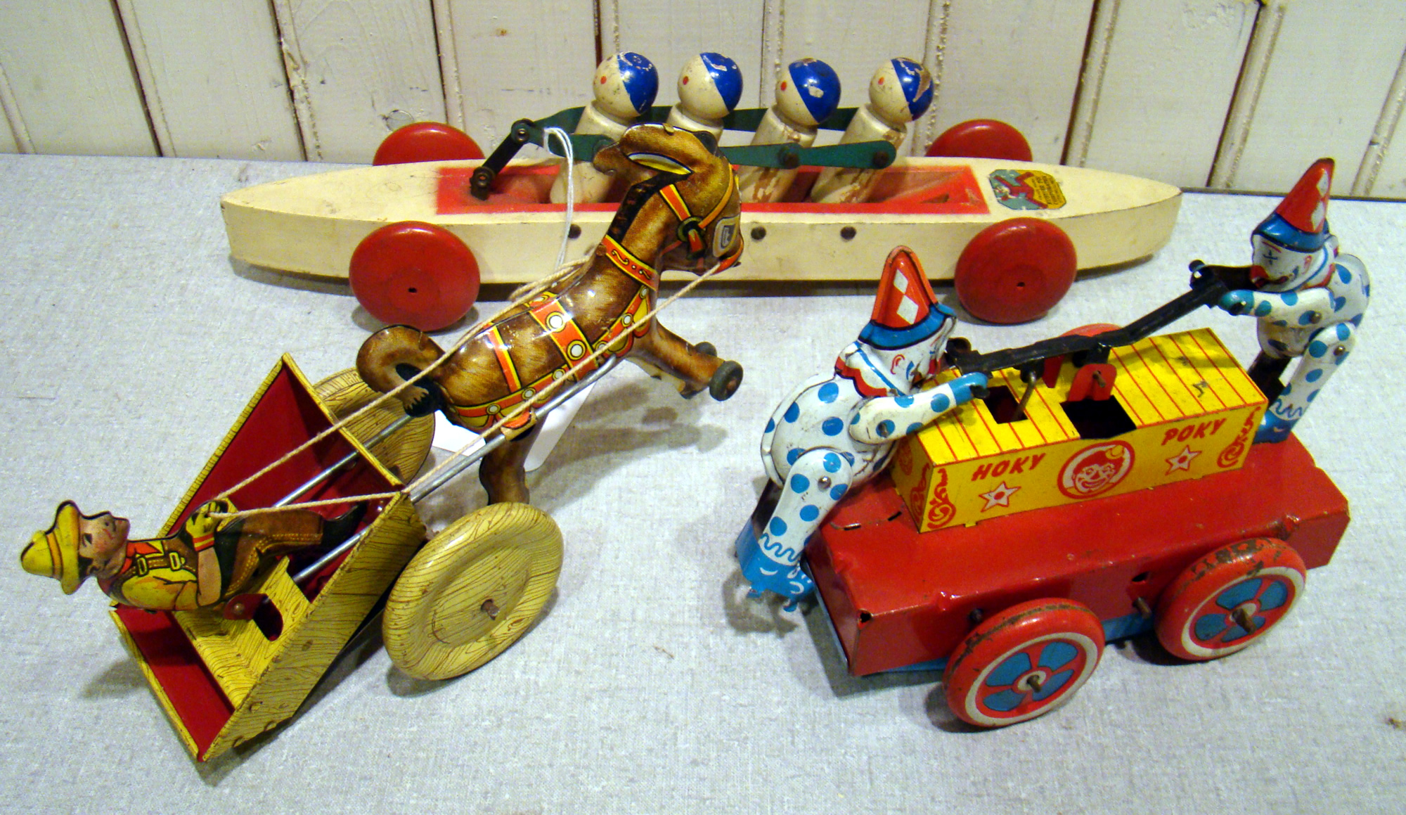 Wooden crew team by Hustler Toy Co.; Hoky Poky tin toy by Wyandotte Toy Co.; two (2) wind-up toys; two (2) lots of old marbles; old game lot; cast iron horse tricycle; early bisque doll; Lionel train lot with several engines, cars, track, etc.